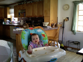 Well, now I'm supposed to have an afternoon snack. So Mama is putting bananas and cookies on my tray. These things are disgusting. In an effort to protest, I stuff the bananas down in the chair so Mama has to clean them up. GROSS!!